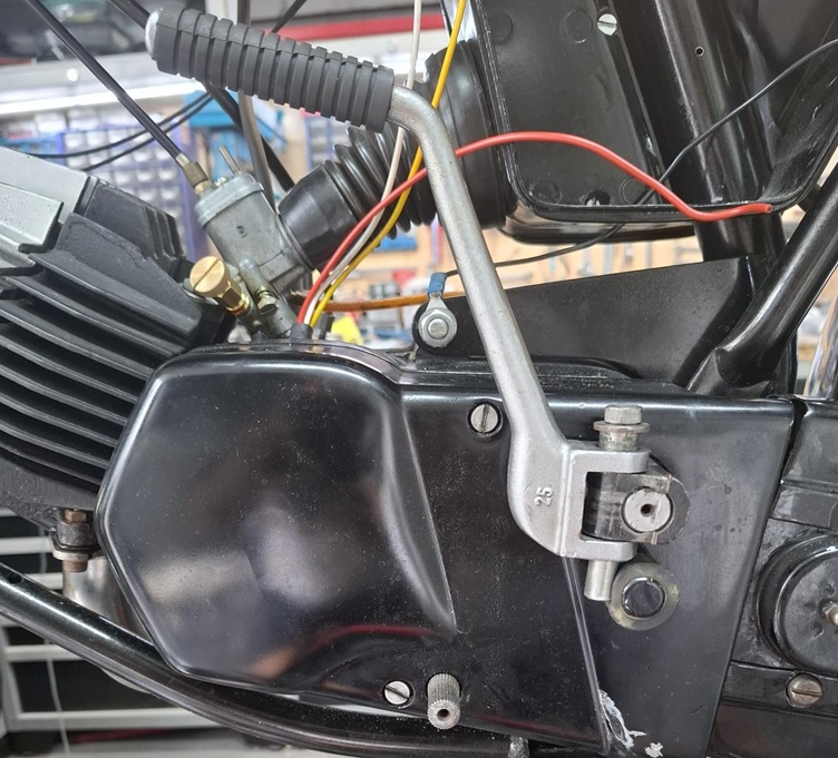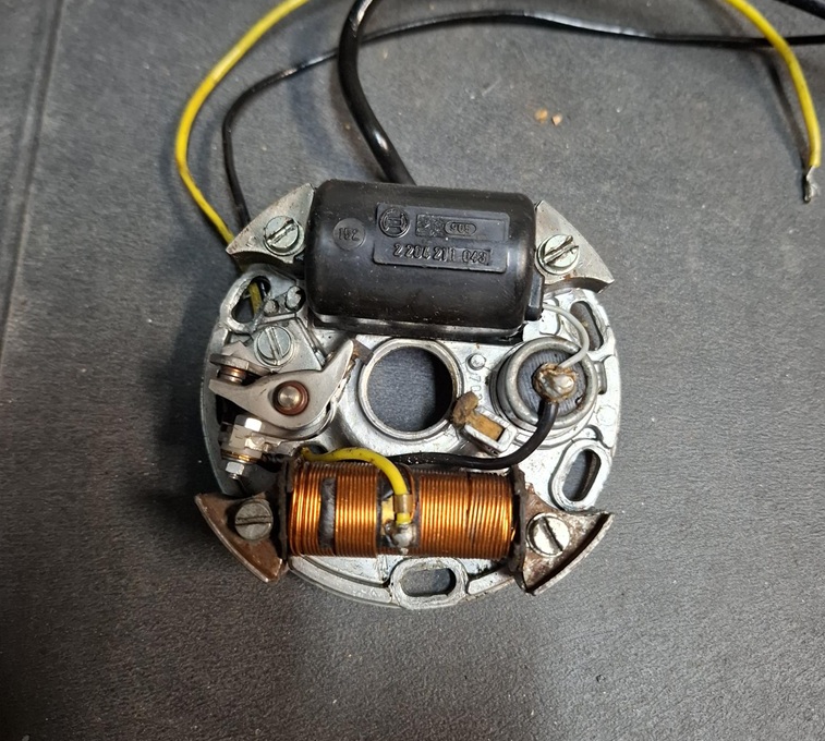 De oude 6 volt wisselspanning installatie. De gele draad is voor de verlichting. De zwarte draad is voor de ontsteking. De contactpunten zorgen voor de onderbreking.