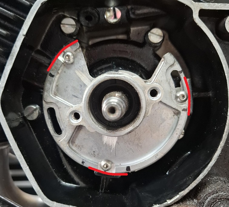 Om de grondplaat van de 12 volt spoelen goed passend te maken moet de diameter iets kleiner gemaakt worden. Dit kan door een heel klein beetje van de grondplaat af te vijlen bij de rode markeringen.
