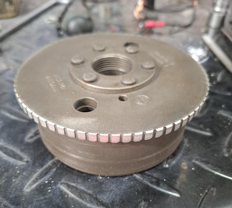 De starterkrans heeft een te grote diameter en zal verwijderd moeten worden. Anders kan de deksel niet gemonteerd worden. Wij hebben deze op de draaibank verwijderd.