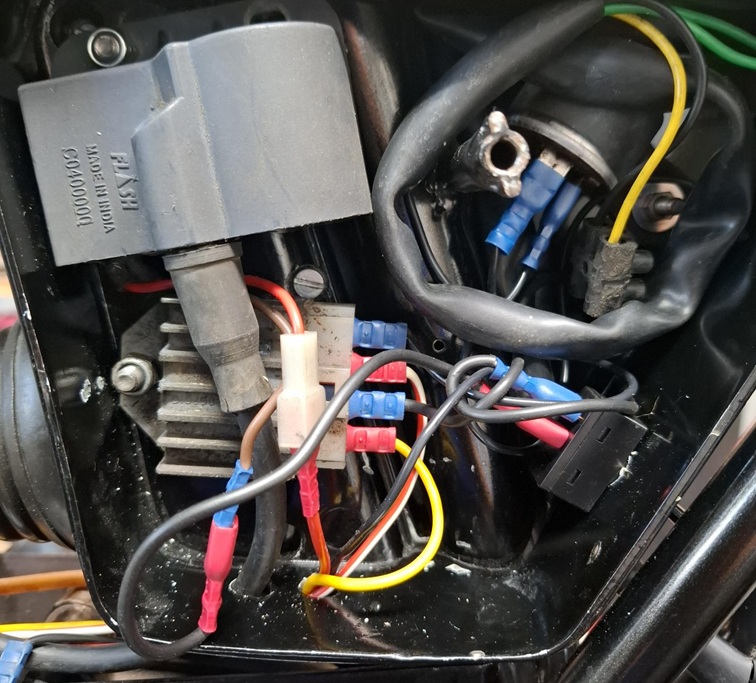 Monteer nu de bobine, de spanningsregelaar/gelijkrichter en het knipperlichtrelais. De rode draad is de plus van de bobine. De bobine kan via de min onderbroken worden door een contactslot of een externe schakelaar. Op de gele en de rood/witte draad komt 12 volt wisselspanning te staan. De gele draad word ook verbonden met de koplamp en het achterlicht. Vergeet niet alle lampjes te vervangen voor 12 volt exemplaren. Voor de knipperlichten is 5 Watt voldoende.